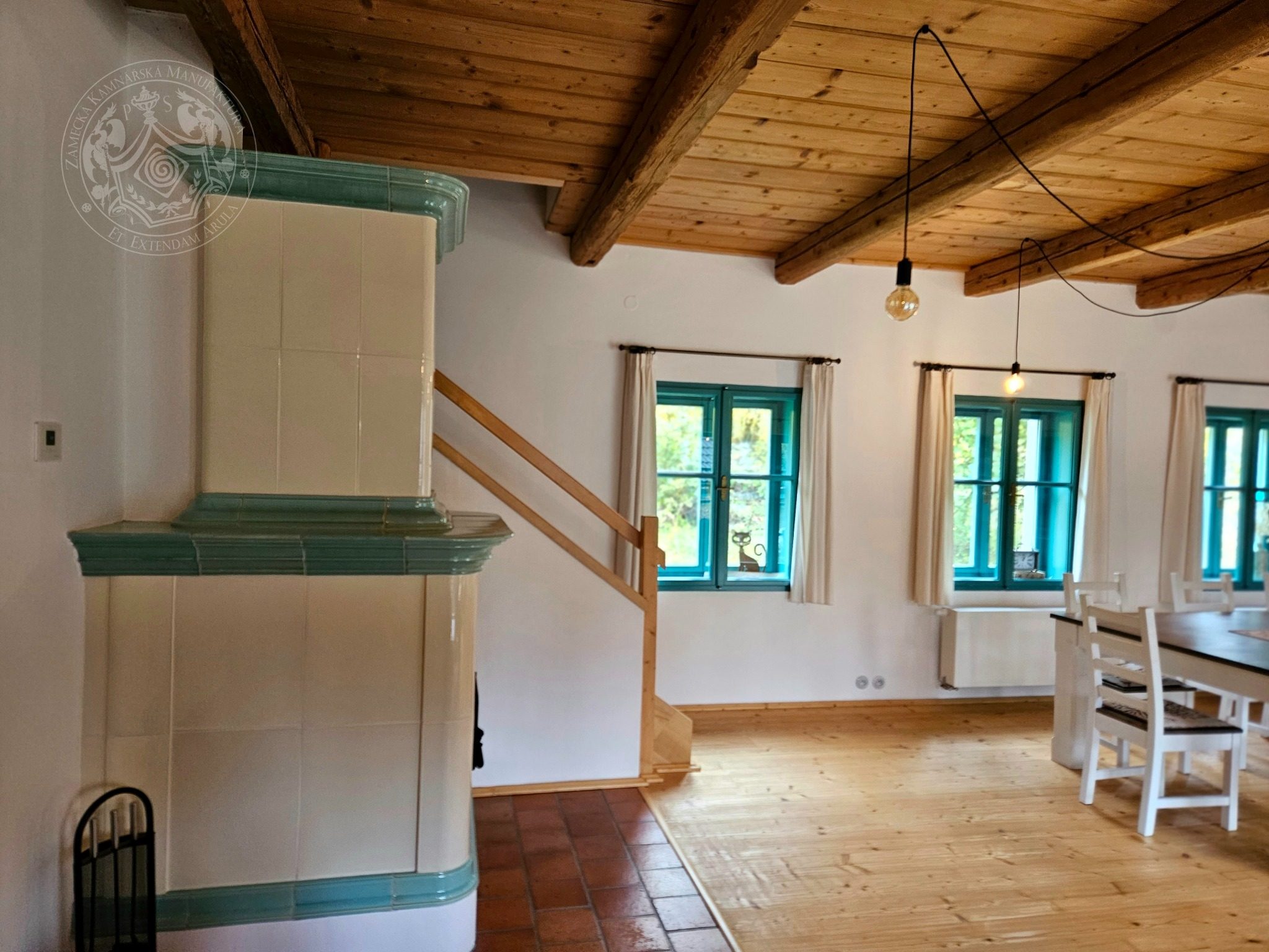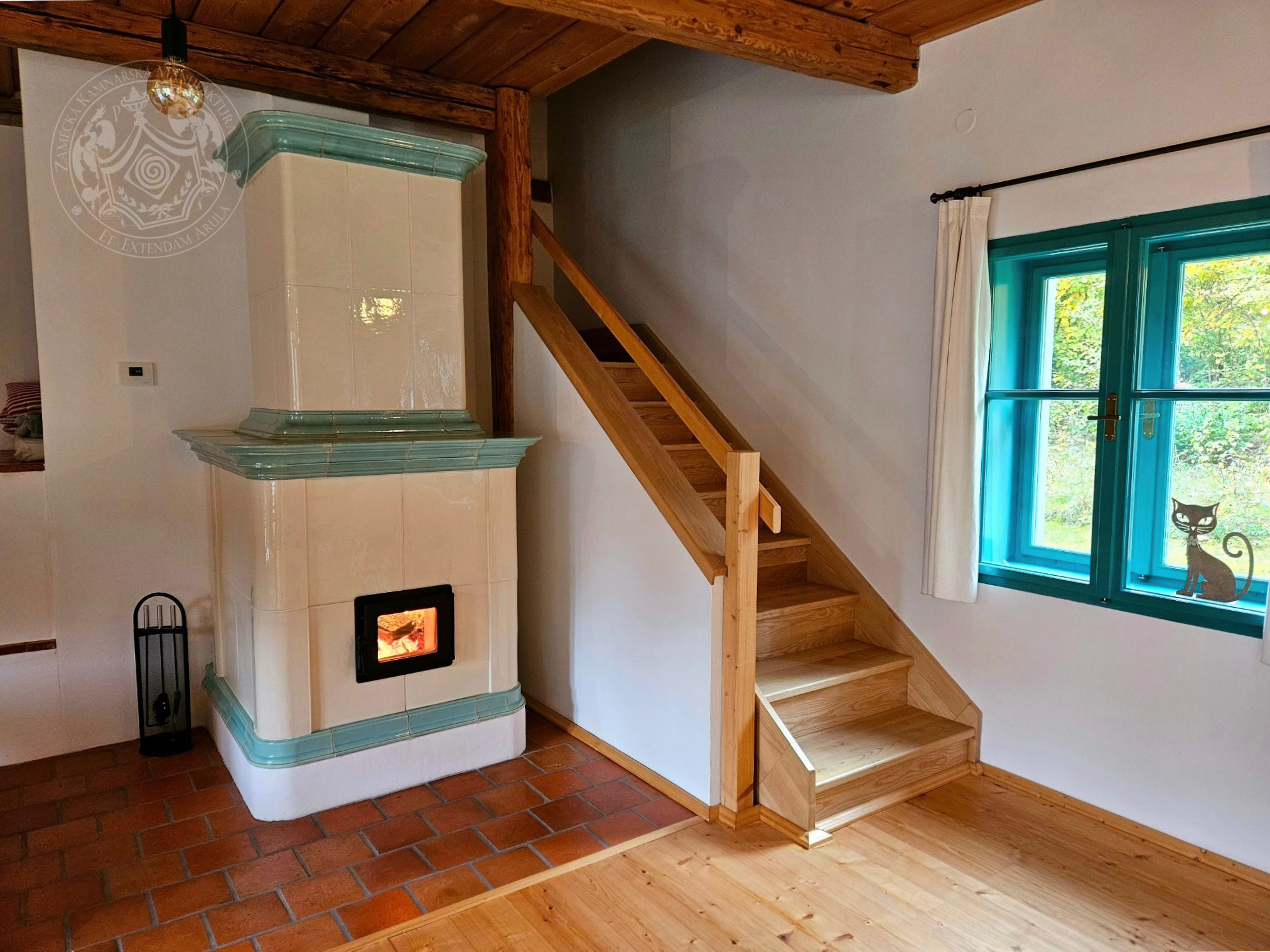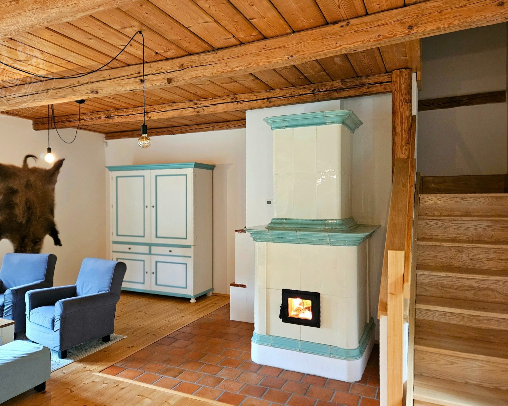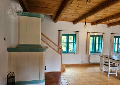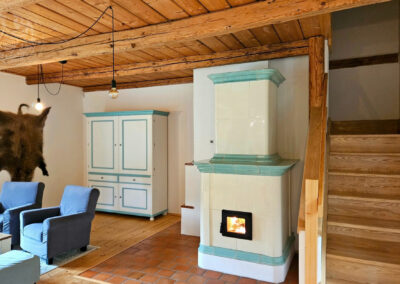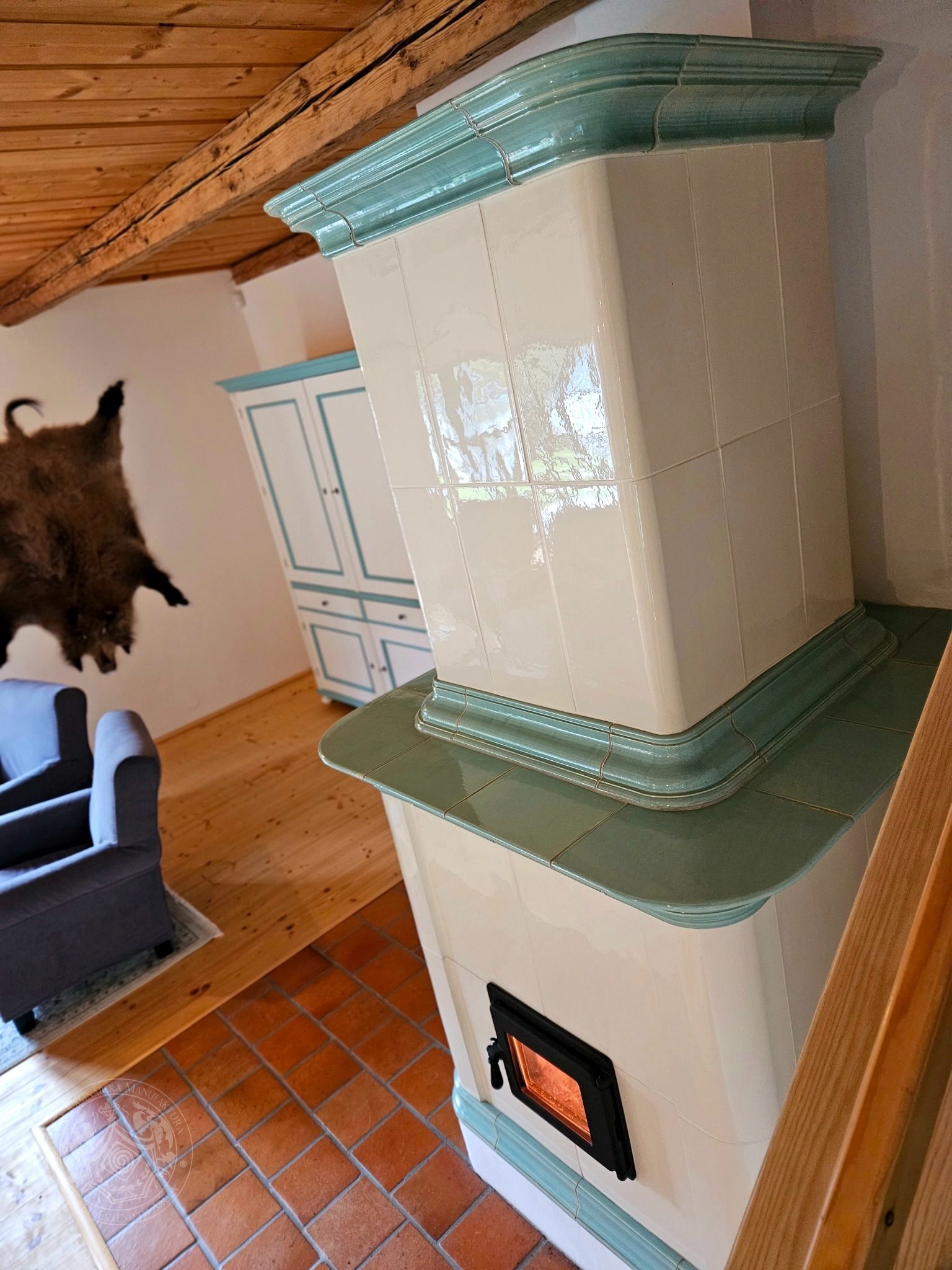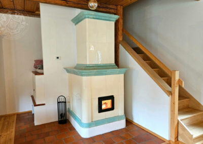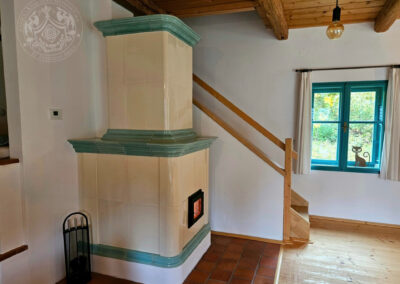 Stavba akumulačních kamen s vyhřívaným ležení byla v tomto případě již od počátku „omezena“ jasně danými skutečnostmi. Půdorys topidla (včetně ležení) byl limitován dávno vybetonovaným relativně malým základem, předem danou pozicí komína s jasnou výškou sopouchu a vystavěnou zdí vynášející schody do patra. Budoucí topidlo tak zákonitě muselo být vyšší než širší. V ostatních parametrech jsme měli jako tvůrci svobodu, kterou jsme využili, jak nejlépe jsme uměli. Sálavá akumulační kamna zde mají ručně vyráběný originální kachlový plášť, individuálně stavěné ohniště, průmyslový spirálový tahový systém a jsou osazena automatickou regulací hoření. Ležení, chcete-li pec, je částečně skryto za zdí schodiště a je z kamen vyhříváno tzv. hypokaustem. Topidlo stojí na samotě v lesích uprostřed Vysočiny nedaleko Křemešníku.