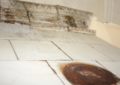 Všechny k sobě patřící části říms byly ve spárách očištěny a spojeny transparentním pojivem do podoby původních kachlů. Chybějící části a otřepky byly vyplněny tmelem pojivem, zabroušeny a zaretušovány do původního tvaru povrchu. Praskliny a tmelené plochy byly ošetřeny penetrací, barevně dotónovány a opatřeny tvrdou transparentní politurou. Drobné povrchové oděrky byly v místě poškození zatmeleny, zabroušeny, napenetrovány, barevně dotónovány a opatřeny tvrdou transparentní politurou.