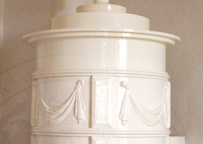 Kamna jsou válcovitého tvaru s vyšší soklovou částí a několikastupňovou horní římsou zakončenou vázou. Kamna jsou provedena v barvě slonové kosti. Svislé dělící kanelurované lišty jsou zakončeny diamantovým vzorem. Spodní část římsy je zdobena draperními festony rozdělenými diamantovým vzorem. Spodní část kalicha vázy je zdobena decentním vzorem perlovce. Tělo kamen je anonymní, bez symbolického reliéfu.