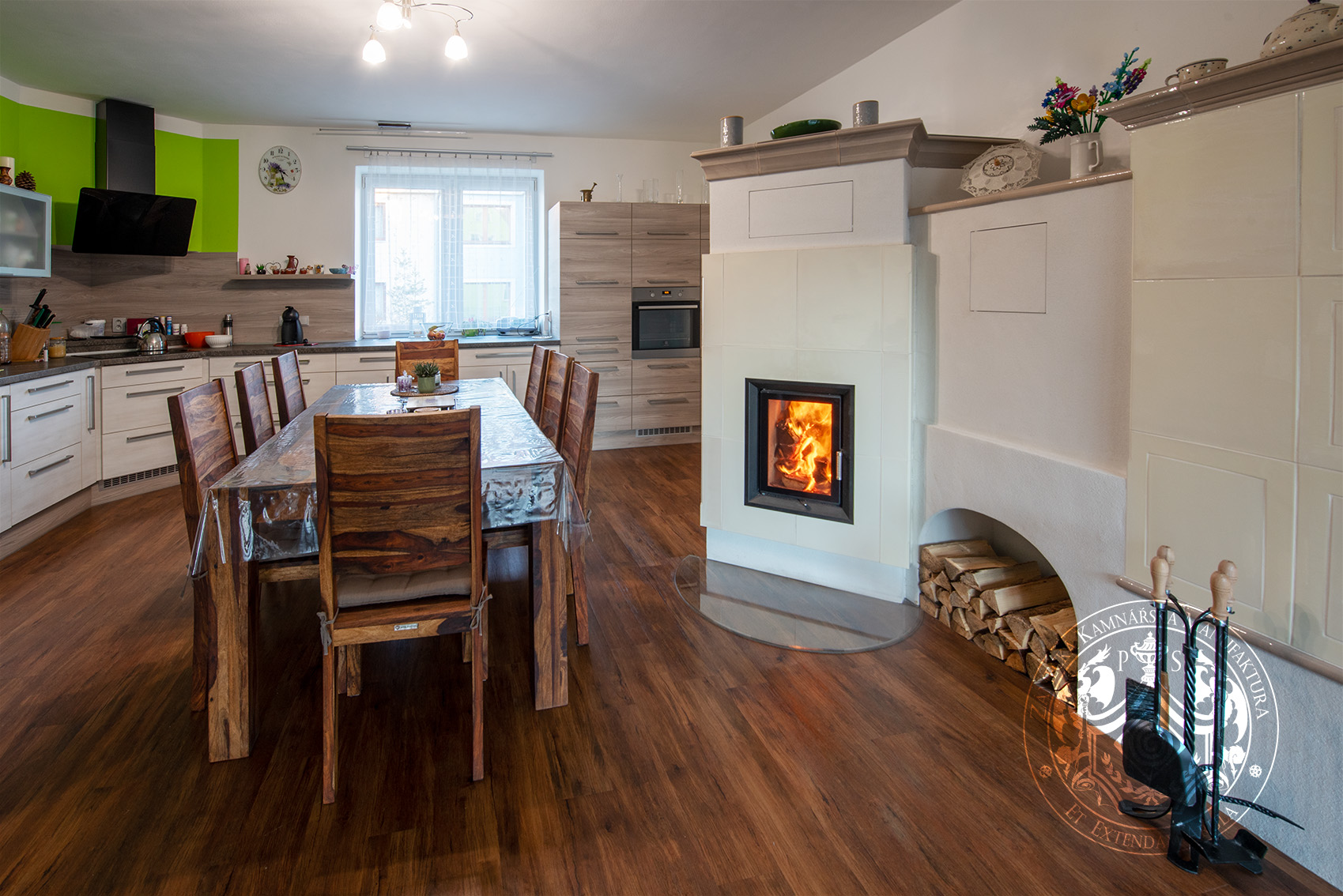 Kachlová kamna mohou být vhodným hlavním zdrojem vytápění i pro nově opravený rodinný dům. Toho příkladem jsou kamna postavená ve vilové zástavbě v Jindřichově Hradci. Hlavní topidlo stojí v obytné kuchyni a jeho ohniště s relativně velikým prosklením je namířené do klidové – obývací části místnosti. Tahový systém však prochází stěnou do vedlejšího pokoje, kde je vystavěna samostatná teplosměnná plocha. Zde je tah i zapojen do nově vyvložkovaného komína. Toto elegantní, moderně pojaté topidlo, skrývá však několik technických zajímavostí.